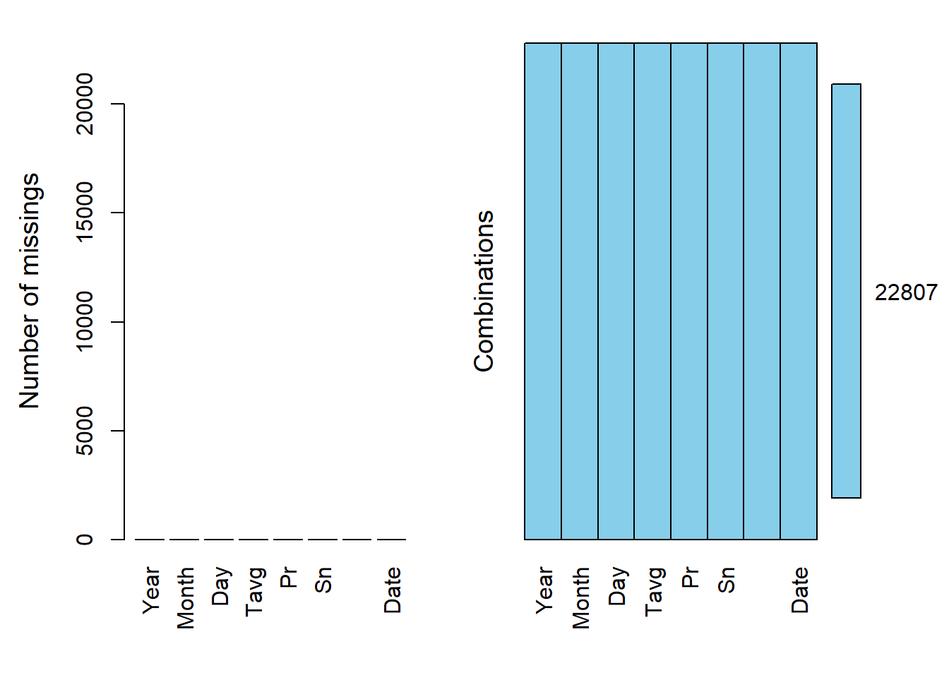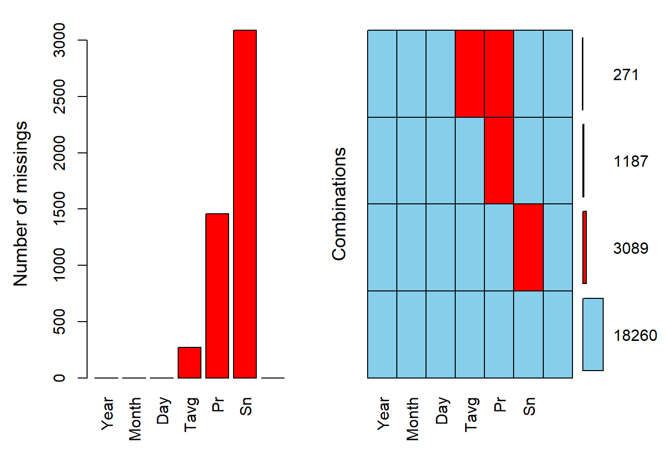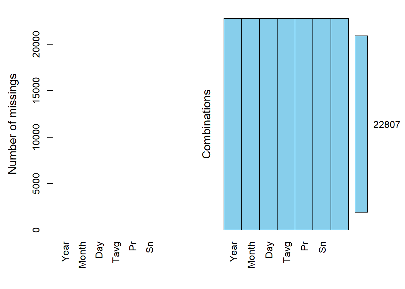 interactive_graph(climate, parametr= 'Sn', "Snow depth")aggr(climate, prop = F, numbers = T) # Пропусков больше нет